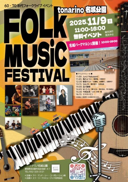 名古屋・名城公園tonarinoで、60〜70年代の名曲が甦る「フォークミュージックフェスティバル2025」が開催!昭和の懐かしいフォークサウンドと温かなメロディーが、秋の空の下で心を包み込みます。世代を超えて愛される楽曲たちがライブで響き渡り、当時を知る人にも新しい世代にも心に残るひとときを届けます。会場にはキッチンカーやマルシェも登場し、音楽とともに食も楽しめる一日です。